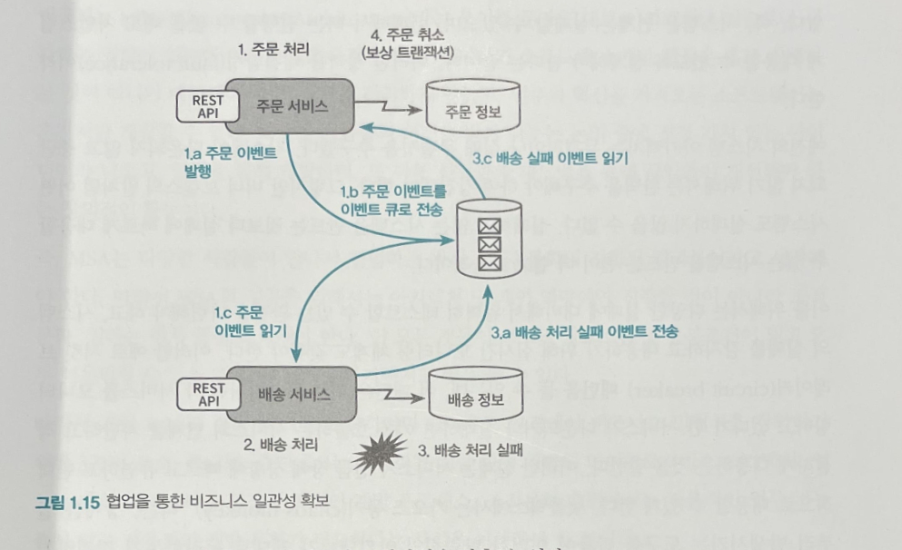 - 이 때 데이터베이스의 일관성 처리 문제가 발생하는데, 각각 다른 서비스를 트랜잭션으로 묶는 경우 서비스의 독립성도 떨어지고 noSQL 처럼 2단계 커밋을 지원하지 않는 경우가 있으므로 비동기 이벤트 처리를 통한 일관성을 강조한다. Eventual Consistency 라는 개념임