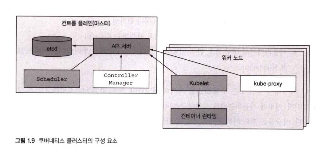 ㄴ 컨트롤러 매니저 : 구성 요소 복제본, 워커 노드 추적, 노드 장애 처리 등과 같은 클러스터단의 기능 수행
