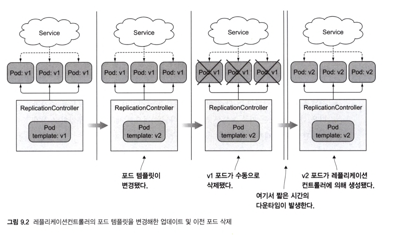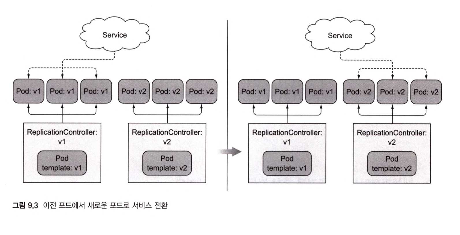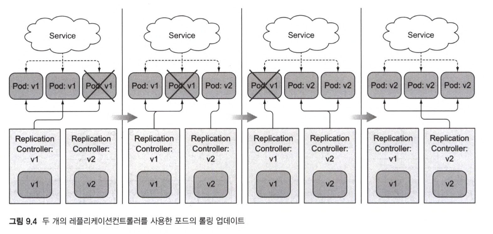 - 이전 레플리케이션컨트롤러를 천천히 스케일 다운하고 새 파드를 스케일 업해 이를 수행할 수 있다.