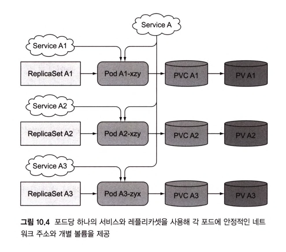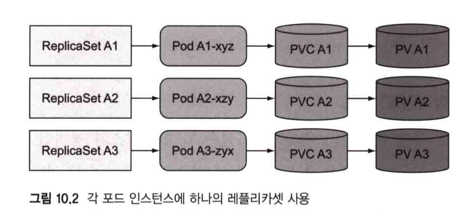 - 각 레플리카가 별도의 퍼시스턴트볼륨 클레임을 사용하도록 만들 수 없다.