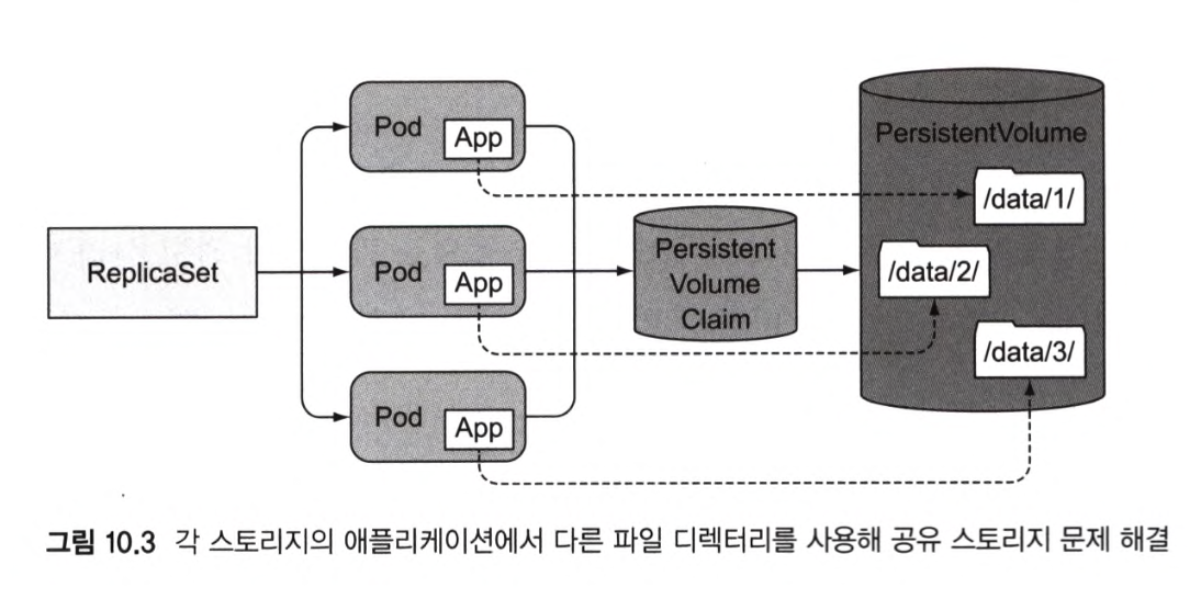 ㄴ 모든 파드가 동일한 퍼시스턴트볼륨을 사용하게 하되 각 파드의 볼륨 내부에서 별도의 파일 디렉터리를 가제하는것.