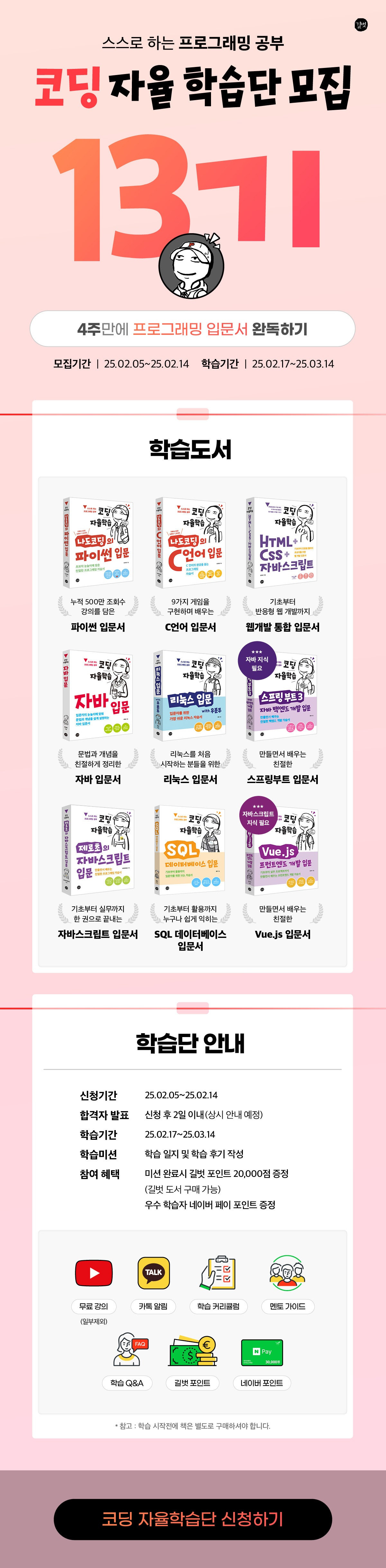 이 글을 쓰고 있는 지금 코딩 자율학습단 13기를 모집하고 있다. ~2/14까지 신청 가능