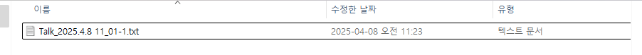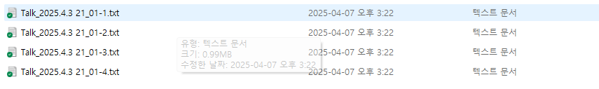알집을 풀면 txt파일이 나오는데, 대화 용량에 따라 파일이 여러개일 수도 있고, 파일이 1개일 수도 있다.