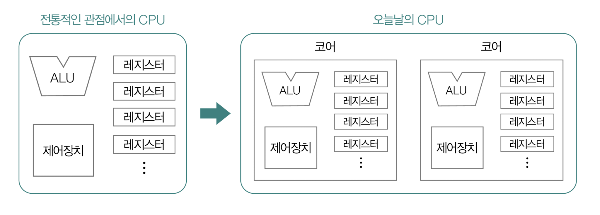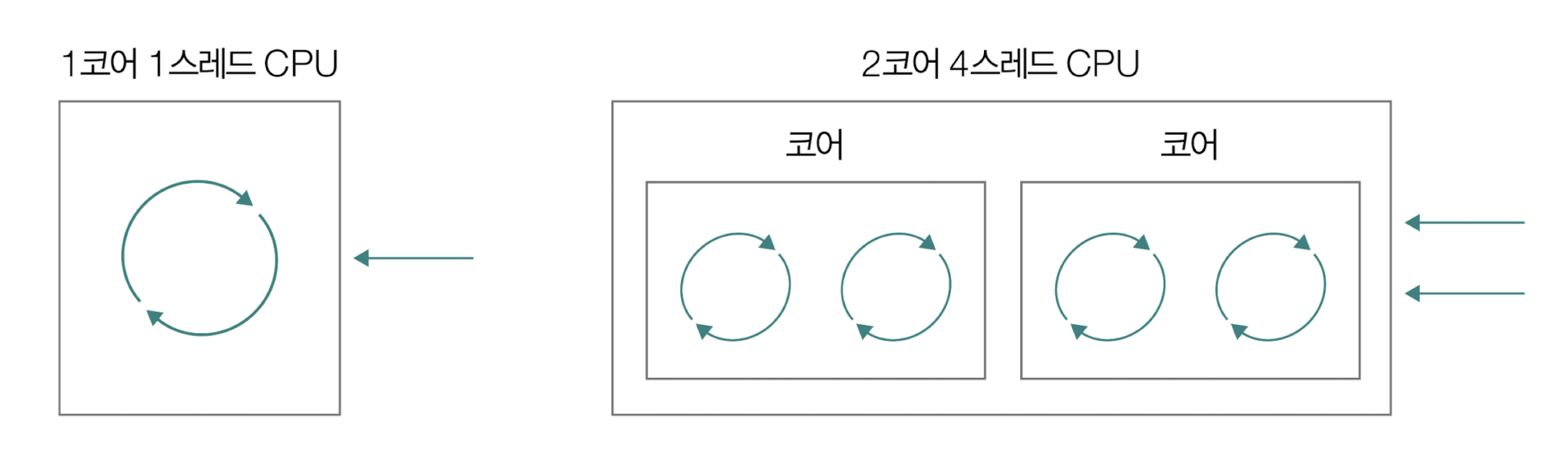- 클럭 속도를 높이는 방법 외에도 코어 수나 스레드 수를 늘리는 방법으로 CPU의 성능을 높일 수 있다.