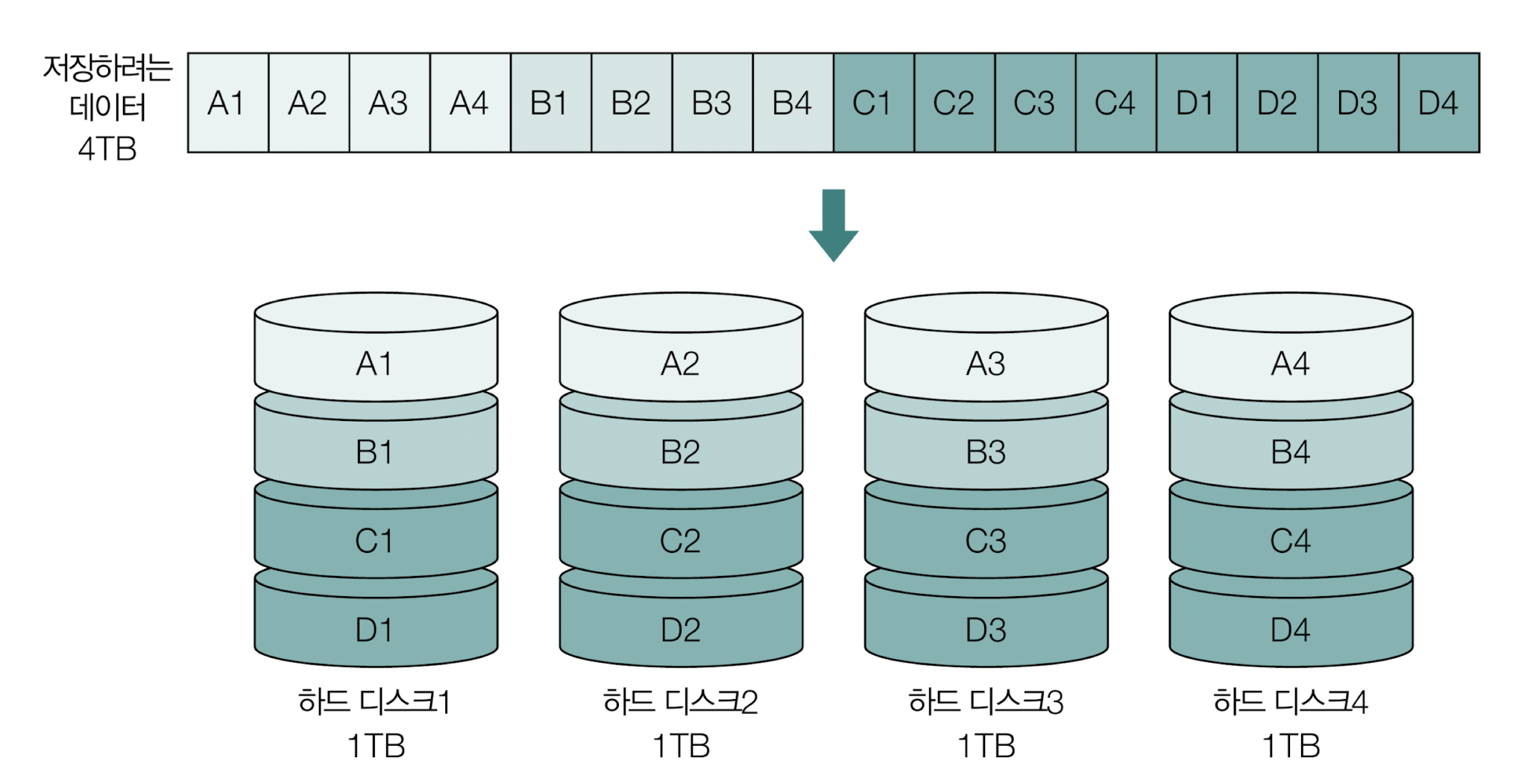 - 하드 디스크1에 문제가 생기면 디스크 2,3,4도 문제가 생긴다.
