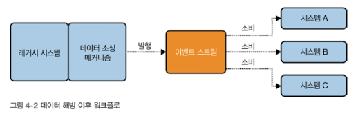 - 데이터를 이벤트 스트림으로 추출하는 카프카 커넥트, 아파치 고블린, 아파치 나이파이 같은 중앙화 프레임워크를 사용하면 된다.
