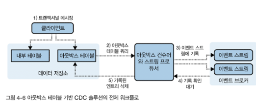 - MySQL, PostgreSQL 등 몇몇 RDB에서 가능하고, 최신 데이터 저장소 대부분은 물리적 로그 선행 기입(WAL)의 프록시 역할 하는 이벤트 API를 제공하기도 한다.