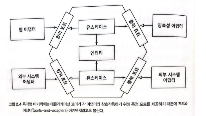 - 육각형 안에는 도메인 엔티티와 이와 상호 작용하는 유스케이스가 있다.
