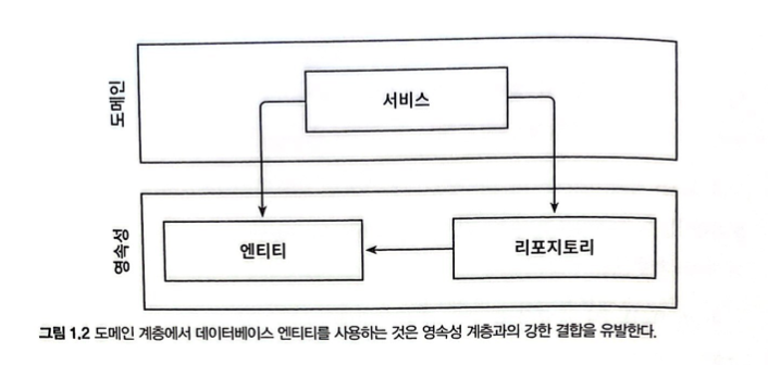 - 계층형 아키텍쳐에서 계층 간 의존성은 항상 다음 계층인 아래 방향을 가리킨다. 그러므로 영속성 계층에 대한 도메인 계층의 의존성 때문에 영속성 계층을 변경할때마다 잠재적으로 도메인 계층도 변경해야 한다.