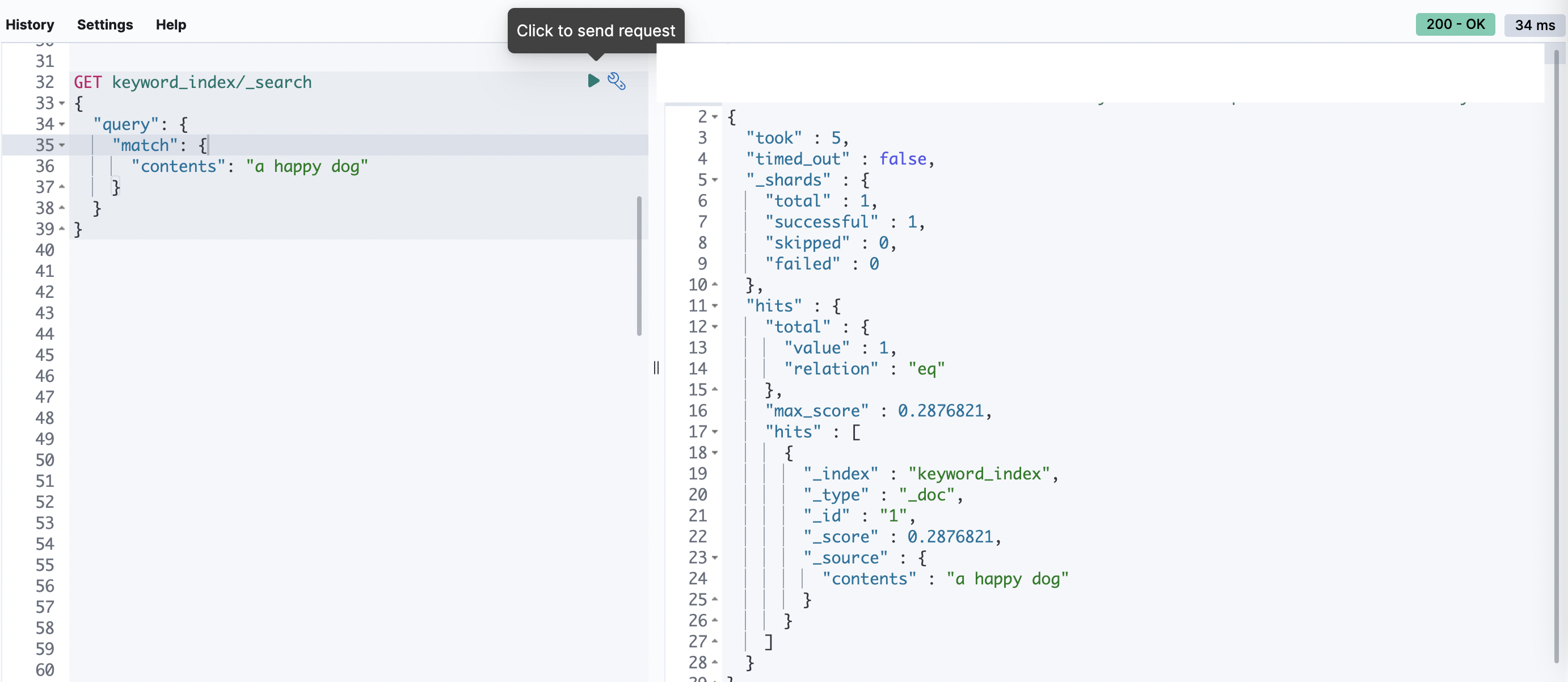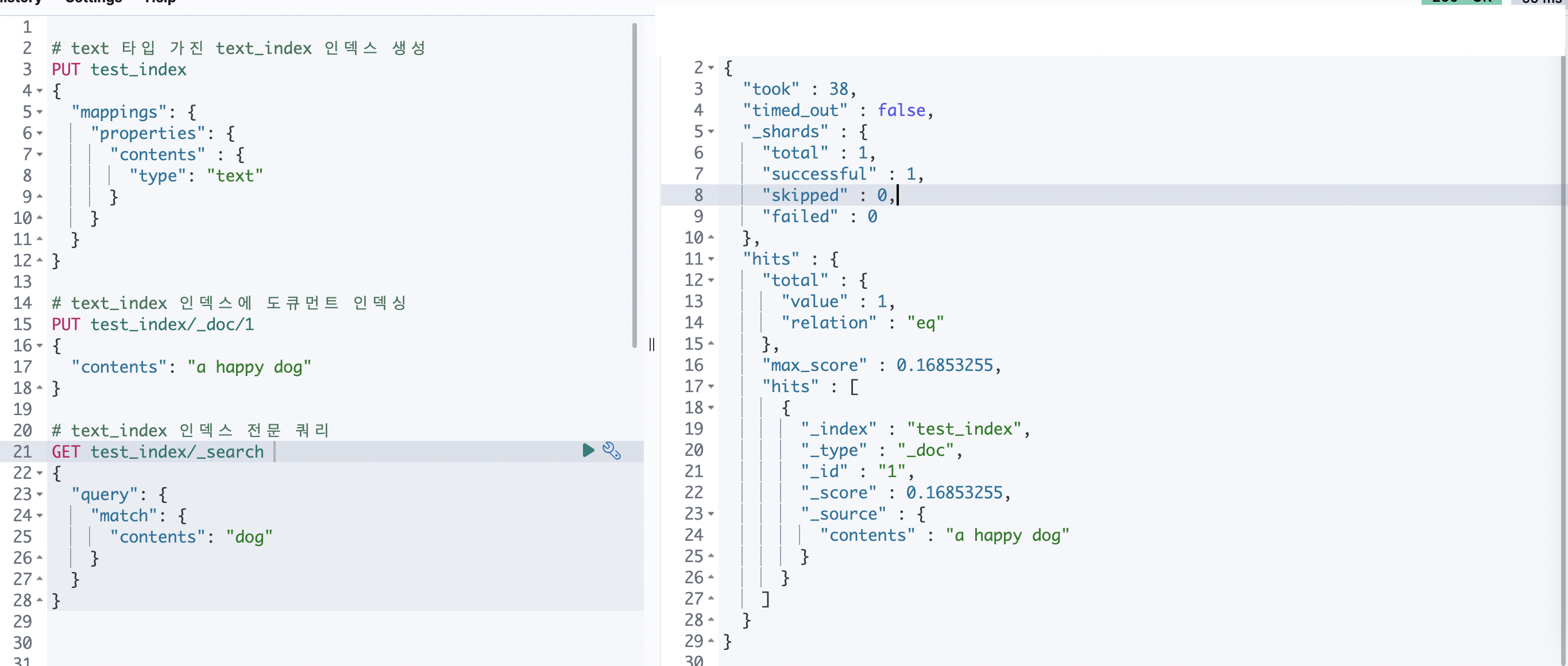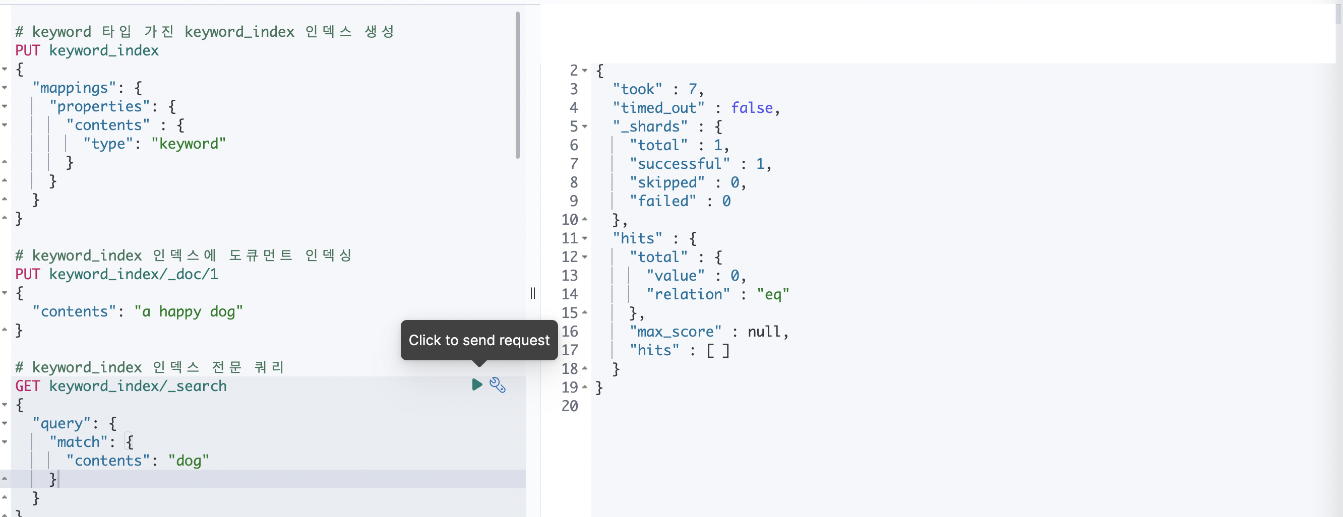 - 키워드 타입은 'a happy dog'라는 1개의 용어를 만든다. 따라서 부분 일치 검색은 어렵지만 대신 완전 일치 검색을 위해 사용할 수 있으며 집계나 정렬에 사용될 수 있음.