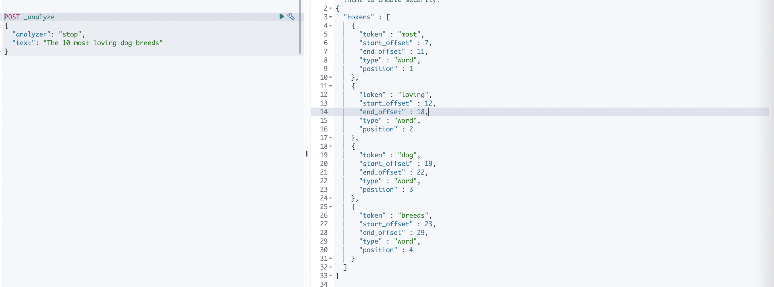 | stop | - simple 분석기와 비슷하지만 스톱필터가 포함되어 있다. [most, loving, dog, breeds] |