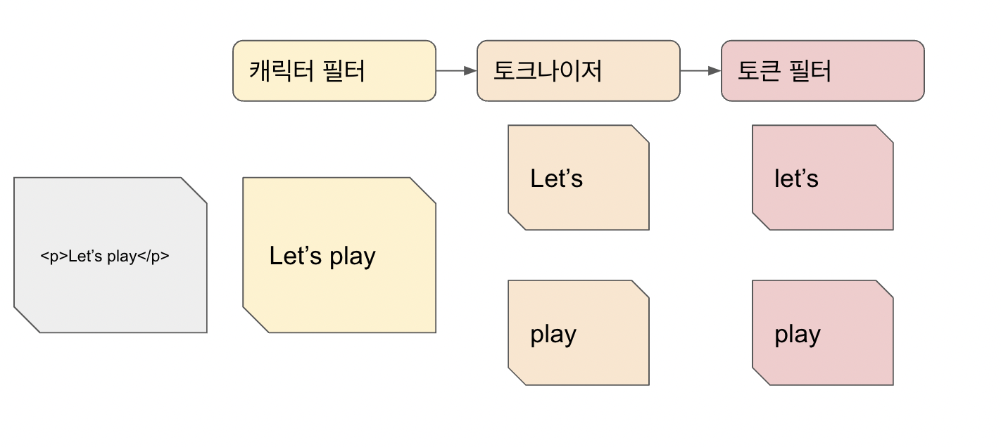 - 분석기에는 하나의 토크나이저가 반드시 포함돼야 하며, 캐릭터 필터와 토큰 필터는 옵션이므로 없어도 되고 여러 개를 함께 사용해도 된다.