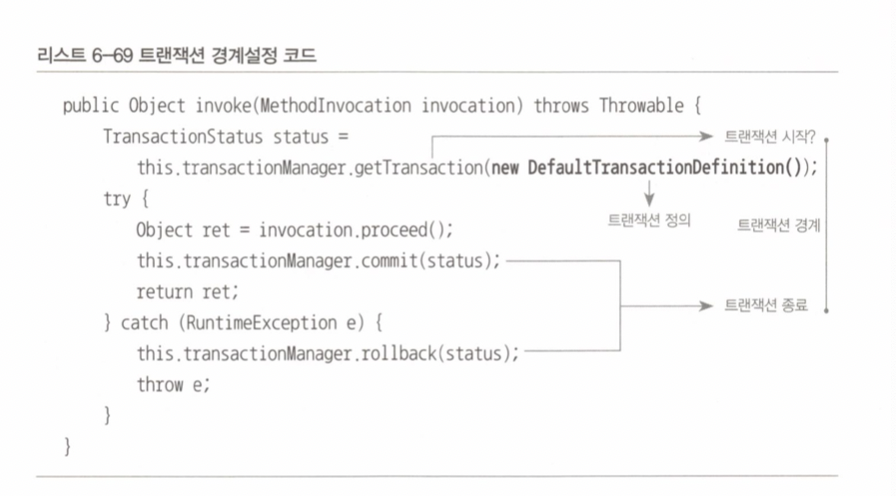 6.6 트랜잭션 속성 6.6.1 트랜잭션 정의 DefaultTransactionDefinition이 구현하고 있는 TransactionDefinition 인터페이스는 트랜잭션 동작방식에 영향을 줄 수 있는 네 가지 속성을 정의하고 있다. 1) 트랜잭션 전파 트랜잭션 경계에서 이미 진행중인 트랜잭션이 있을때/없을때 어떻게 동작할지 결정하는 것 PROPAGATION_REQUIRED 가장 많이 사용되는 트랜잭션 전파 속성진행 중인 트랜잭션이 없으면 새로 시작하고, 이미 시작된 트랜잭션이 있으면 이에 참여한다. DefaultTransactionDefinition의 트랜잭션 전파 속성PROPAGATION_REQUIRES_NEW항상 새로운 트랜잭션을 시작한다. PROPAGATION_NOT_SUPPORTED 트랜잭션..
