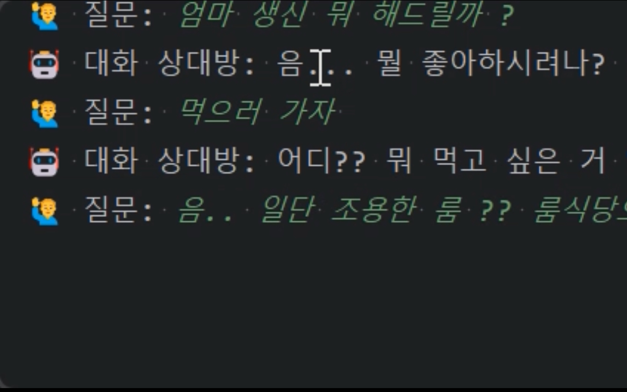 요즘 핫한 생성형 AI 모델 중 하나인 Google Gemini를 직접 테스트해봤다. .카카오톡 대화내역을 기반으로 챗봇을 만들 수 있을까? 하는 궁금증에서 시작되었다. Windows 환경에서 LangChain과 Gemini를 연동하고,FAISS 벡터 DB를 활용해 실제 대화 내용을 검색하고 응답하는 구조로 구현했다. 실행하면, 내가 직접 훈련시킨 챗봇과 자연스럽게 대화할 수 있다..저는 언니와 나눈 카카오톡 대화 내용을 바탕으로 챗봇을 만들었고,덕분에 엄마 생신에 관한 대화를 챗봇과 나눠봤는데 신기하고 재밌었다. 1. 카카오톡 대화방의 대화 내용 다운로드 먼저 카카오톡의 대화 내용 내보내기 기능을 통해 텍스트 파일로 대화 내용 전체를 받는다. 그러면 이메일에 zip 파일로 묶여서 파일이 온..